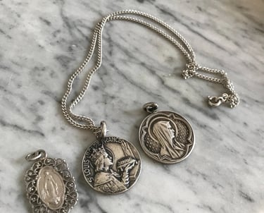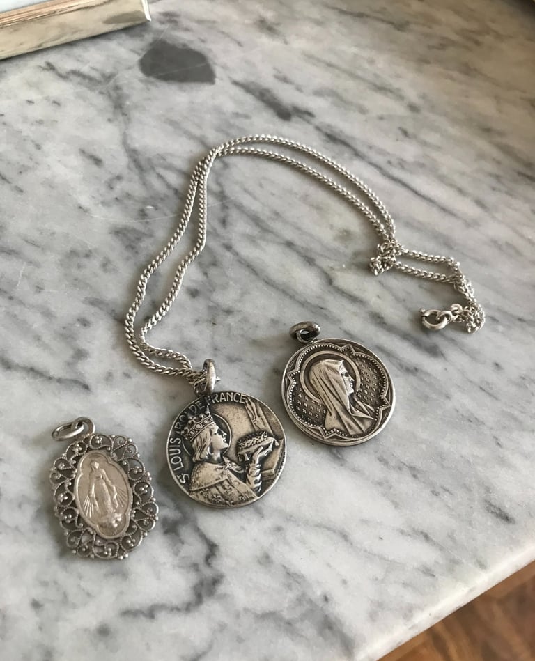 Chacun d'eux a une histoire particulière liée à des médailles religieuses : tous ont eu un merveilleux présent en recevant une médaille pour leur baptême étant bébé; cadeau du parrain et de la marraine. Pour nos 10 ans de mariage, j'ai offert une médaille d'un Christ à mon mari. Certaines médailles ont été cassées ou perdues au bord d'un terrain de rugby. Quand il a fallu les remplacer, notre bourse était tendue vers d'autres objectifs. Une fois de plus, c'est chez une petite antiquaire lyonnaise que j'ai aperçu ces trois beautés dont une médaille religieuse de Saint Louis. Toutes les trois en argent massif. "Maison Amen" est née à Lyon avec ces trois premières médailles, une évidence. J'ai commencé à chiner des médailles religieuses anciennes en plaqué or ou en argent dans un but simple : que ces médailles puissent être portées tous les jours, qu'elles soient à des prix raisonnables et accessibles, que ces bijoux reflètent notre amour de la Vierge Marie en ne restant pas enfermées dans une jolie boîte.